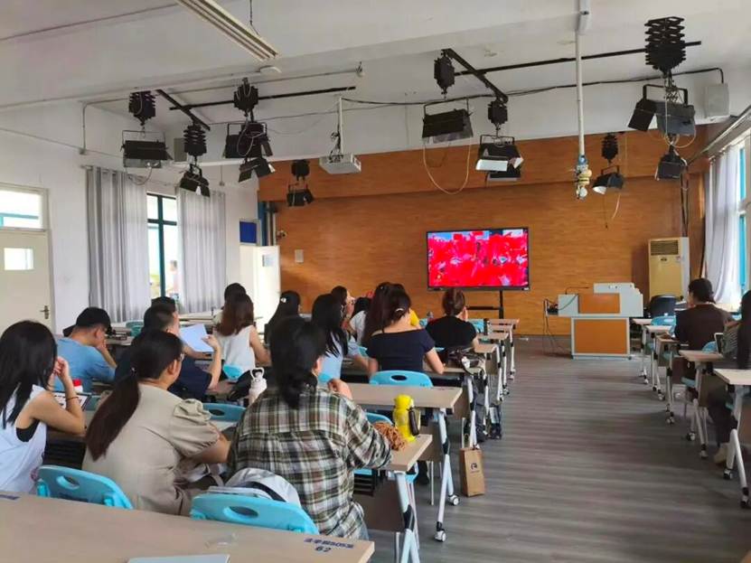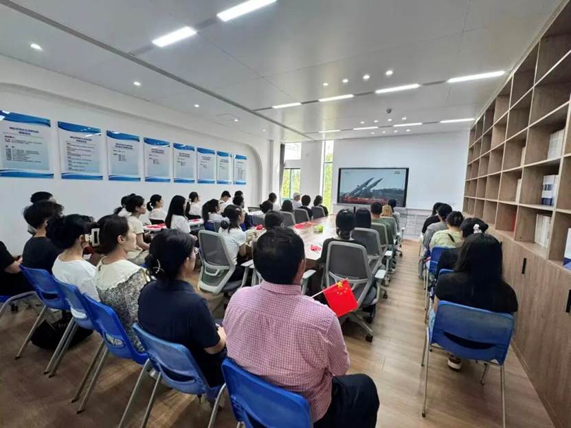 随着直播中天安门广场上国旗护卫队铿锵的步伐,场内师生手持国旗,高唱国歌。当方队经过时,许多师生眼眶湿润,现场多次响起热烈掌声。威武雄壮的受阅方队迈着铿锵有力的步伐走过,各类现代化装备依次亮相,展现了国家的自信与力量,也带来强烈的震撼与鼓舞。